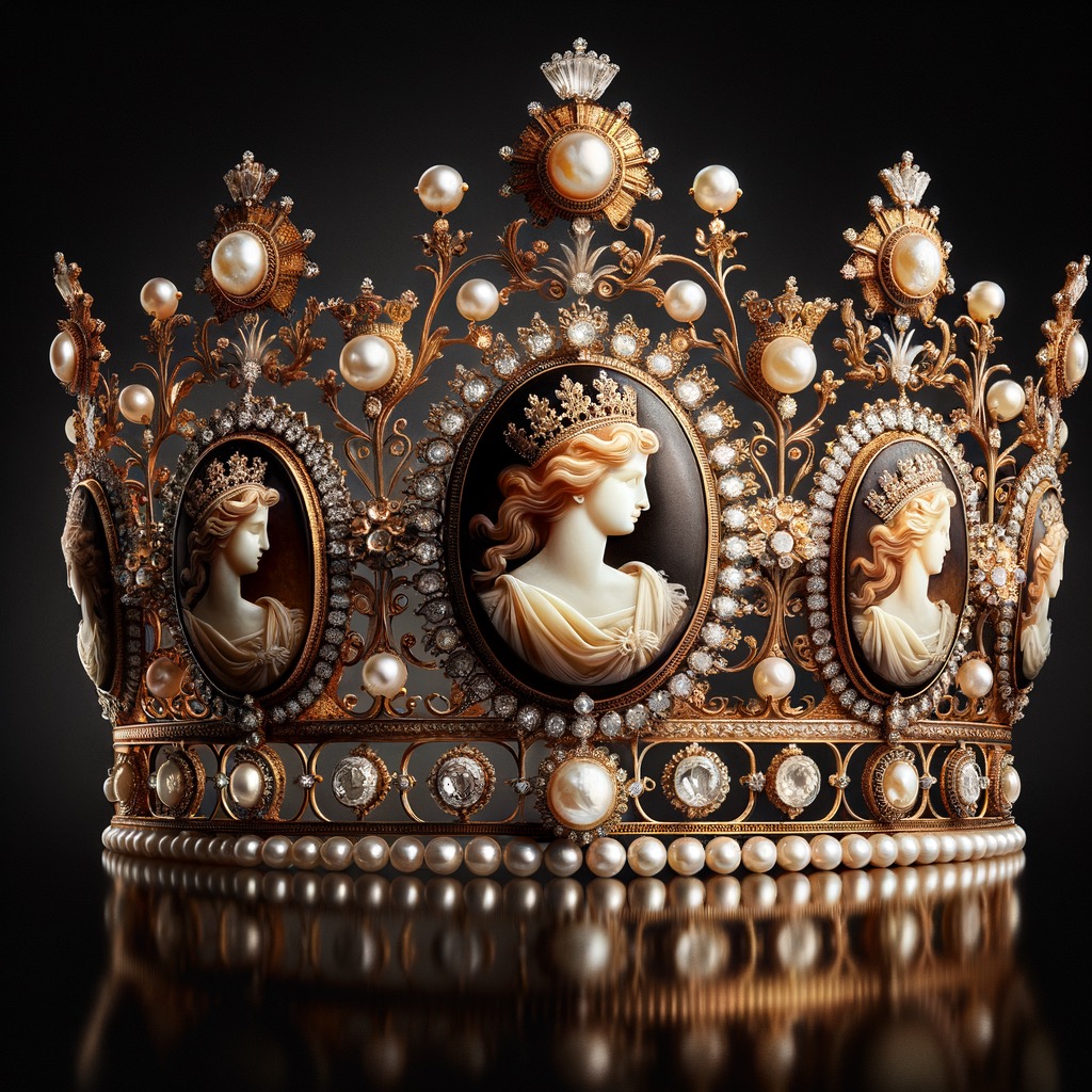 현재 왕실에서 사용되는 대부분의 티아라가 다이아몬드로 화려하게 장식된 것과 달리, 카메오 티아라는 다이아몬드를 전혀 사용하지 않은 매우 드문 경우입니다. 대신 시드 펄(작은 진주)과 금, 그리고 정교한 카메오 조각만으로 우아한 아름다움을 자아냅니다.